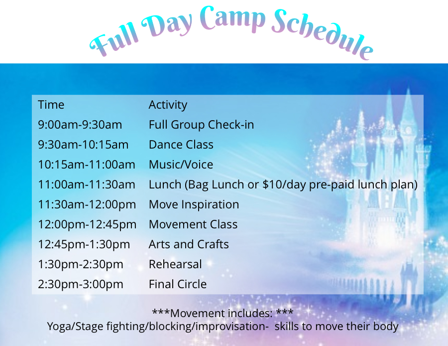 | Frozen | July 17-21 | 3+ | 9:00am-12:00pm | $200.00 |